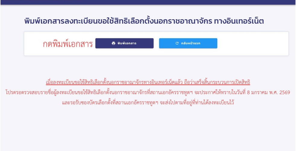 โปรดตรวจสอบรายชื่อผู้ลงทะเบียนขอใช้สิทธิเลือกตั้งนอกราชอาณาจักร ตามประกาศของสถานเอกอัครราชทูตฯ ในวันที่ 8 มกราคม 2569 และรอรับซองบัตรเลือกตั้งที่สถานเอกอัครราชทูตฯ จะส่งไปตามที่อยู่ที่ท่านได้ลงทะเบียนไว้ เมื่อได้รับซองแล้ว โปรดรีบส่งซองบัตรเลือกตั้งที่กากบาทแล้ว กลับมายังสถานเอกอัครราชทูตฯ ภายในวันที่ 27 มกราคม 2569